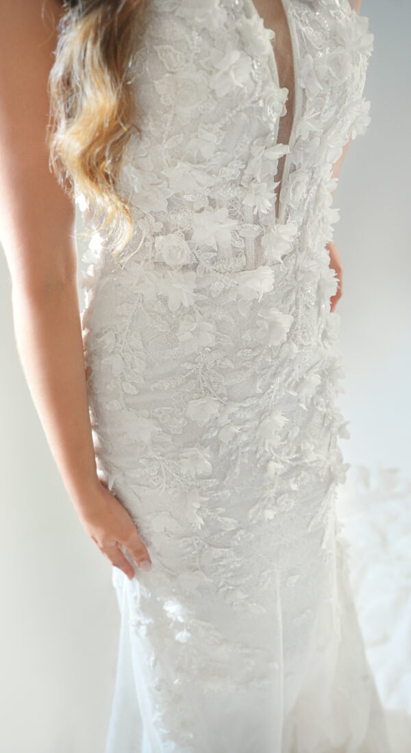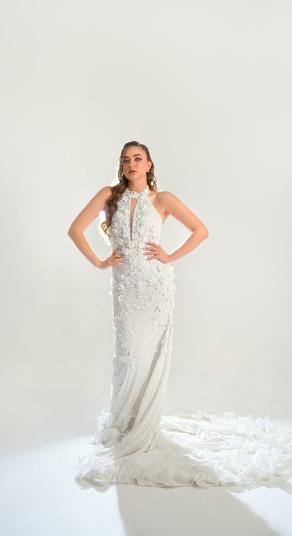 The Elayna gown captures effortless elegance with its delicate lace embroidery and soft, flowing silhouette. Designed for the bride who dreams of understated beauty, every detail whispers grace and purity.
